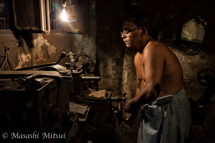 旋盤工場で働く男。小さな裸電球で手元を照らしながらの作業だ。