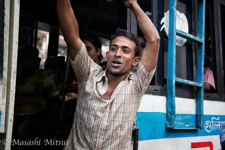 バスの呼び込みをする男。でかい声を張り上げ、車体をバンバン叩いて客を呼び込む。