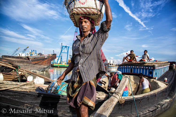 チッタゴンの船着き場で塩を運ぶ男。南部の塩田で作った塩を船で運び、チッタゴンにある工場で精製する。