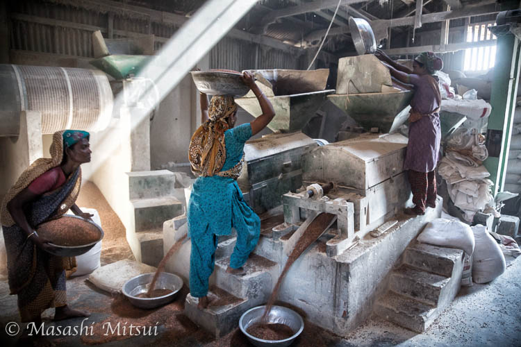 豆の脱穀を行う女たち。古めかしい機械を使っている。