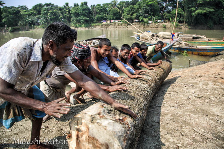 船を使って運ばれてきた材木を陸揚げする男たち。バングラデシュでは製材所も川の近くに作られていることが多い。