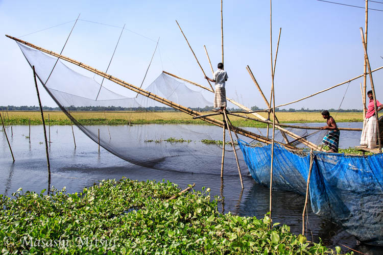 川底に仕掛けた網を引っ張り上げて魚を捕る