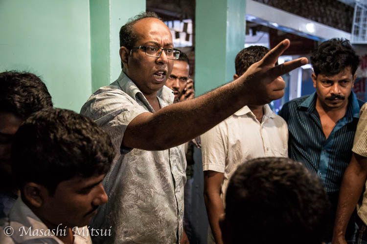 魚の卸売市場で声を張り上げる男。競りは即断即決で行われる。