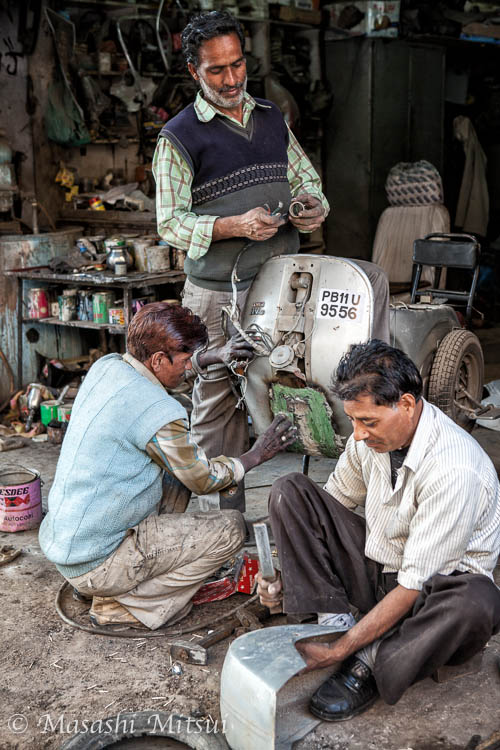 恐ろしく古いスクーターを修理する男たち。壊れても何度も繰り返し直して使うのがインド流だ。
