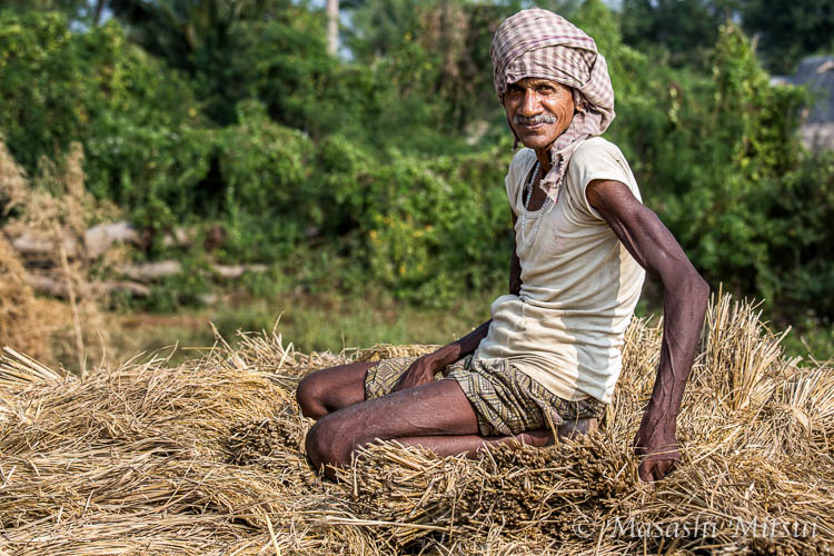 積み上げた稲藁の上に座って一休みする男。ワラは牛のエサにする。