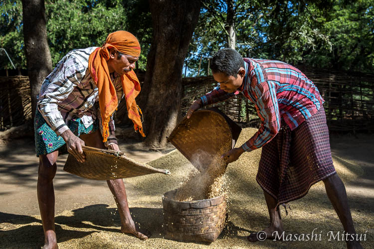 収穫した米をカゴに入れて量をはかる男。半分は地主の分、残りの半分は自分たちの取り分になるそうだ。小作農の苦労を感じさせる光景でもあった。