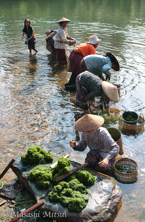 川底に生えている川海苔を取っている女達。 採った海苔は棒で叩いて伸ばし、板の上に広げて数日間乾燥させる。酒のつまみには最高だ。