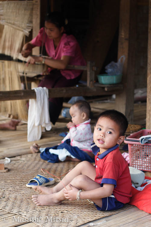 どこの家でも、女達が子供達の面倒を見ながら機を織る姿があった。