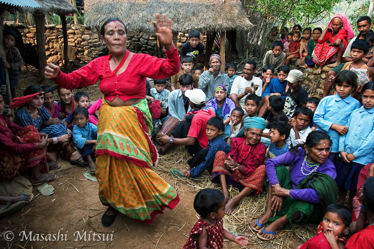 ネパールの結婚式は長い。 まず新郎が新婦の家まで迎えに行き、そこで儀式や踊りを済ませた後、今度は二人揃って新郎の家に戻ってくるのである。二人が近くに住んでいたらいいけれど、遠くに住んでいる場合は数日かかることもある。 新郎の家では、二人が到着するまでの間、親戚の女達がずっと踊り続けていた。誰かが休むとその代わりに誰かが踊る。太鼓と鐘のリズムはいつまでも途切れることなく続いていた。