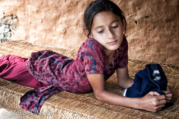 ネパールの家屋は屋内よりも軒下の方が居心地がいい。天気のいい日中なら、窓が小さく電灯もない部屋の中にこもる人は稀であり、みんな明るくて風通しのいい軒下に集まってくる。軒下にはござが敷いてあり、昼寝するのにもうってつけの場所なのだ。 昼寝から目を覚ましたばかりの少女が軒下にいたので、僕はカメラを向けた。少し気怠そうだったけれど、とても美しい横顔だった。