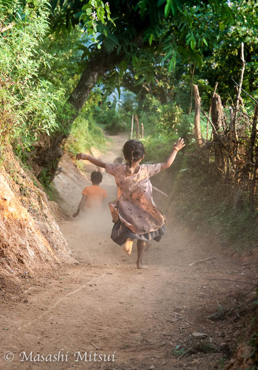 急な坂を一目散に駆け下りていく子供。 土煙が元気の証だ。