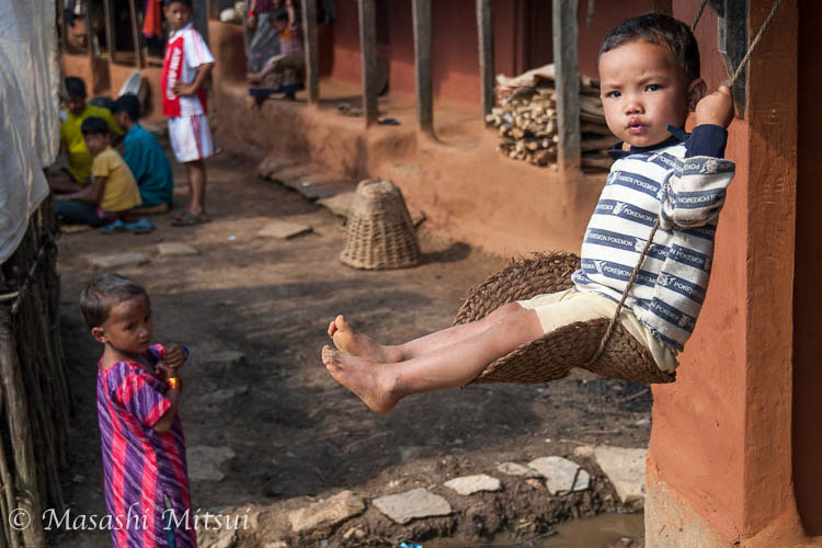 大木だけでなく、家の梁にも即席のブランコが取り付けられる。 小さな子供はこちらの方がお気に入りのようだ。