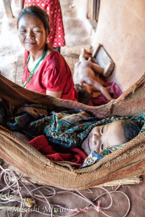 揺りかごの中で静かに寝息を立てていた赤ん坊が目を覚ました。 ネパールの幼児は不審者(つまり僕のような外人)を見ると、火がついたように泣き出す場合が多いのだが、この子は人見知りしないのか、ニコニコと笑ってくれた。