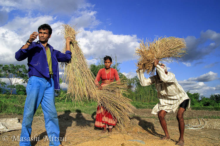刈り取った稲を地面に叩き付け、脱穀をする。一切を自動でやってくれる機械は、まだこの地方にはあまり普及していない。