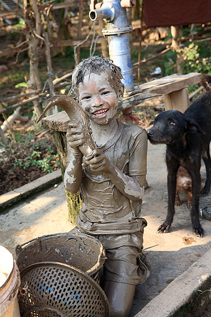 乾季で水かさの減った池で、男の子が魚を捕まえていた。