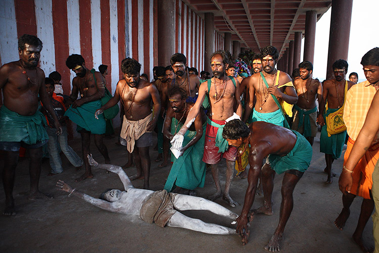 タミルナドゥ州にあるティルチェンドゥール寺院で行われていた儀式は、30人ほどの集団が歌い踊りながら回廊を練り歩くというものだった。