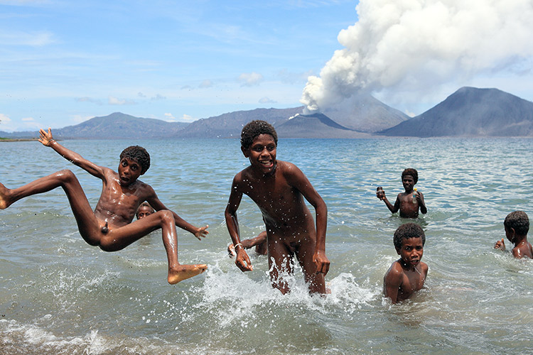 美しい海と噴煙を上げる火山をバックに、小学生が水遊びをしていた。