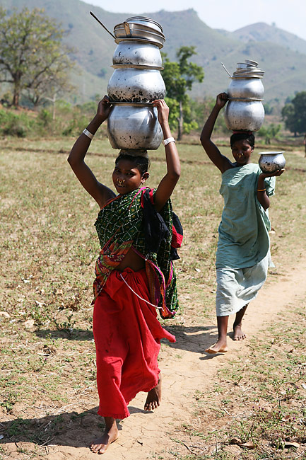 近くの川で食器を洗い、家まで運ぶ女たち。