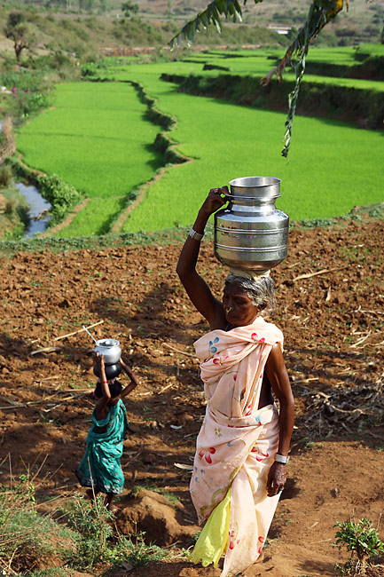 近くの川で食器を洗い、家まで運ぶ女たち。