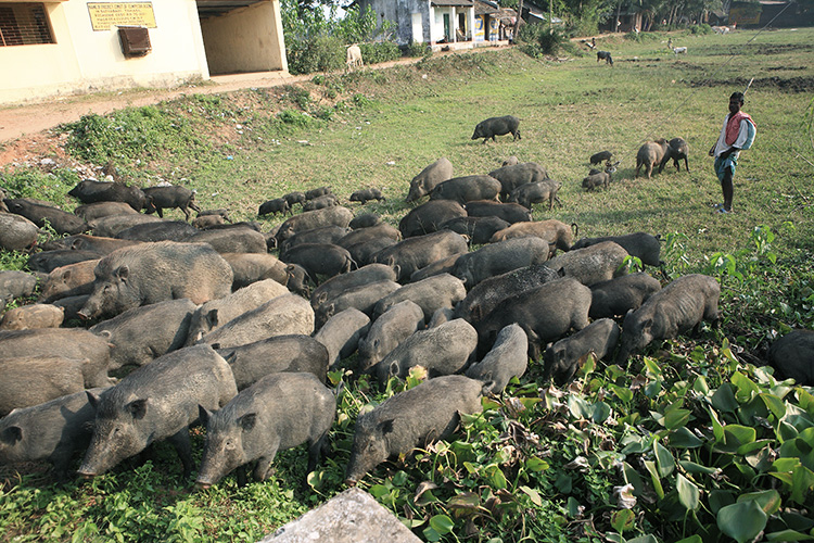羊や牛の放牧はどの国にもあるが、豚の放牧というのはインドでしか見られない光景だった。