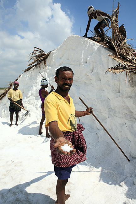 インド南部のタミルナドゥ州の海岸線沿いに、広大な塩田地帯があった。日差しが強く、海からの風が吹きつけるこの地域は、塩作りに適しているようだった。