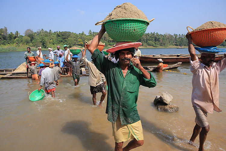そんなケララの川で、川底の砂を集めている男たちに出会った。