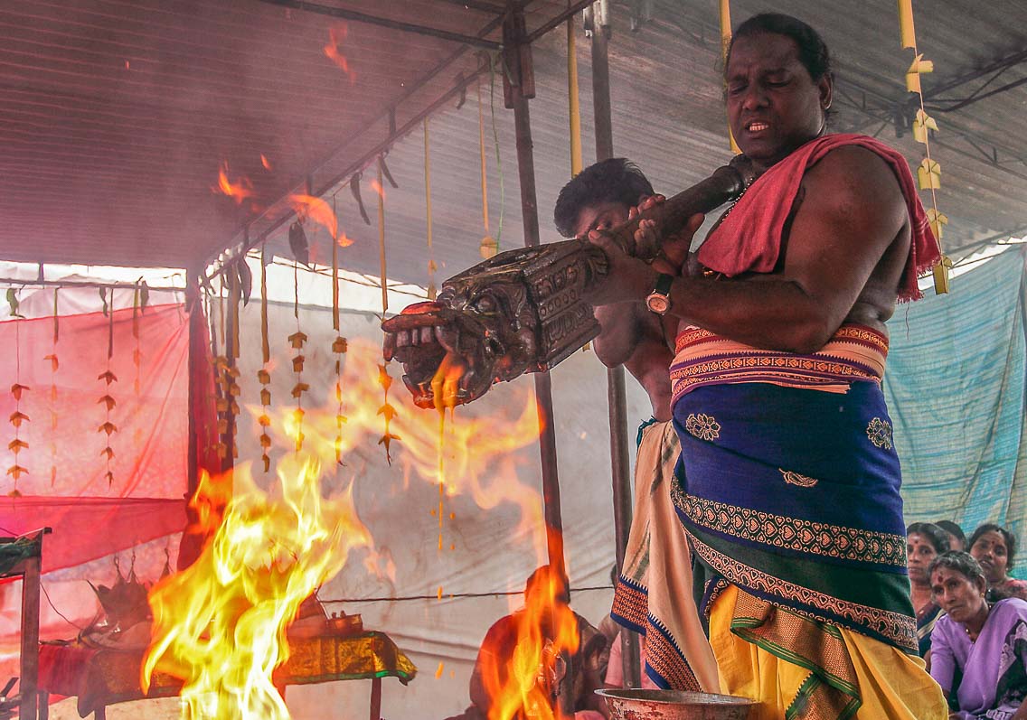 ワニが口を開けたようなおどろおどろしい化け物の彫刻がついた棒を、祭壇の炎に晒しているブラマン。化け物の口からは黄色のどろりとした液体が流れ出している。その液体が炎の中に入ると、火の勢いが増す。あたかも怪物の口が炎を吐き出しているかのような、異様な光景だった。