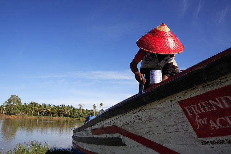 漁船のペンキ塗りをしていた男。真っ赤な帽子が目立っていた。