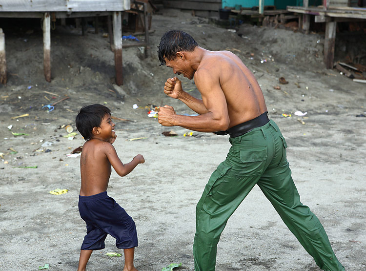 ボクシングの真似をして遊ぶ親子。