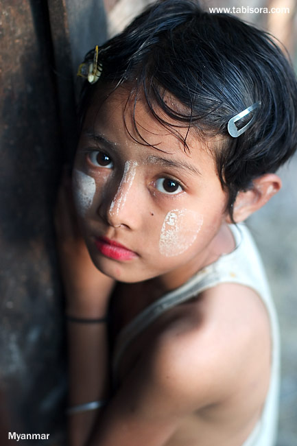 ミャンマーの女性と子供達が顔に塗っているのは、「タナカ」と呼ばれる天然化粧品&日焼け止めである。タナカの木の幹をすり下ろしたものに少量の水をくわえて顔に塗る。塗り方は人によって様々である。タナカは日差しの強いこの国にはなくてはならないファッションアイテムなのだ。
